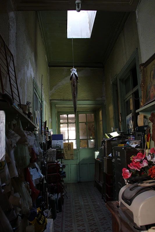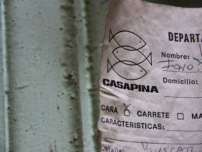 Casapina: construção de adobe de pouco mais de 100 anos, localizada em calle Agustinas nº 2770, bairro histórico Yungay, Santiago do Chile. Tradicional casa de três pátios: estreita, germinada e muito comprida. Loja de pesca.