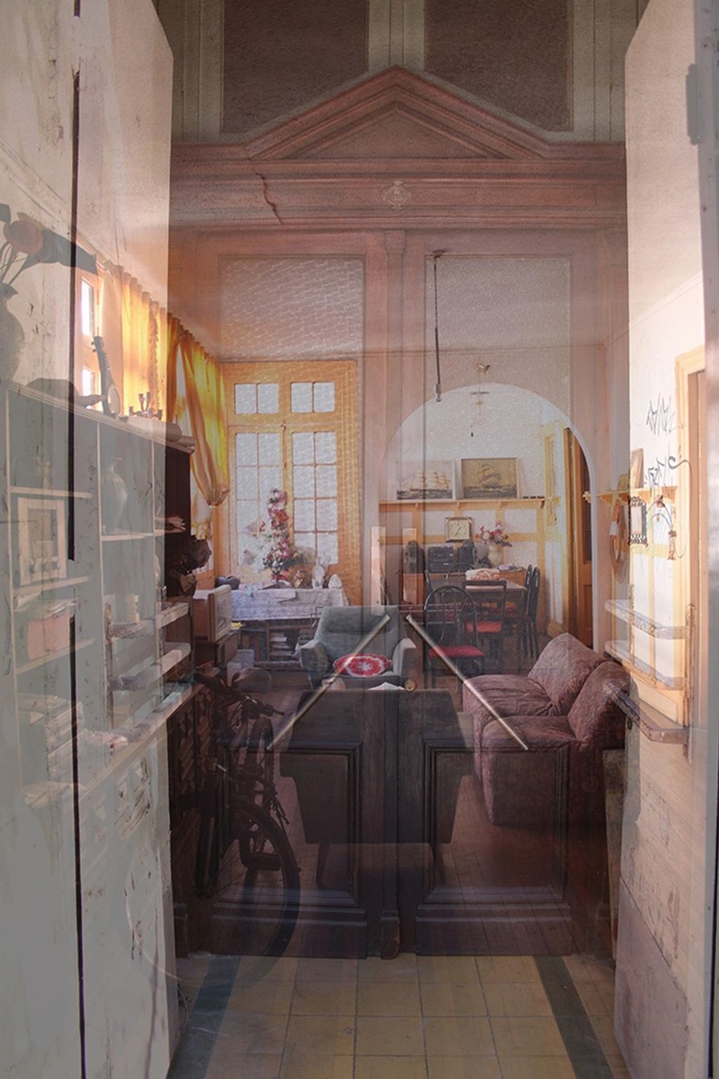 Tudo começa com o desejo de portar comigo a velha casa da família onde morou minha avó paterna, em Santiago do Chile. No desejo de me apropriar dela, decidi reconstruí-la progressivamente através de trabalhos visuais. Era uma casa feminina e repleta, abarrotada de objetos e memórias que, juntamente com o adobe, multiplicavam-lhe o peso e a densidade. Sem intervalos ou vazios que pudessem aliviar-lhe os efeitos da gravidade. Público e privado eram dimensões internas e sobrepostas, a partir da situação inverossímil de uma loja de pesca dentro da sala de jantar, por mais de 40 anos.