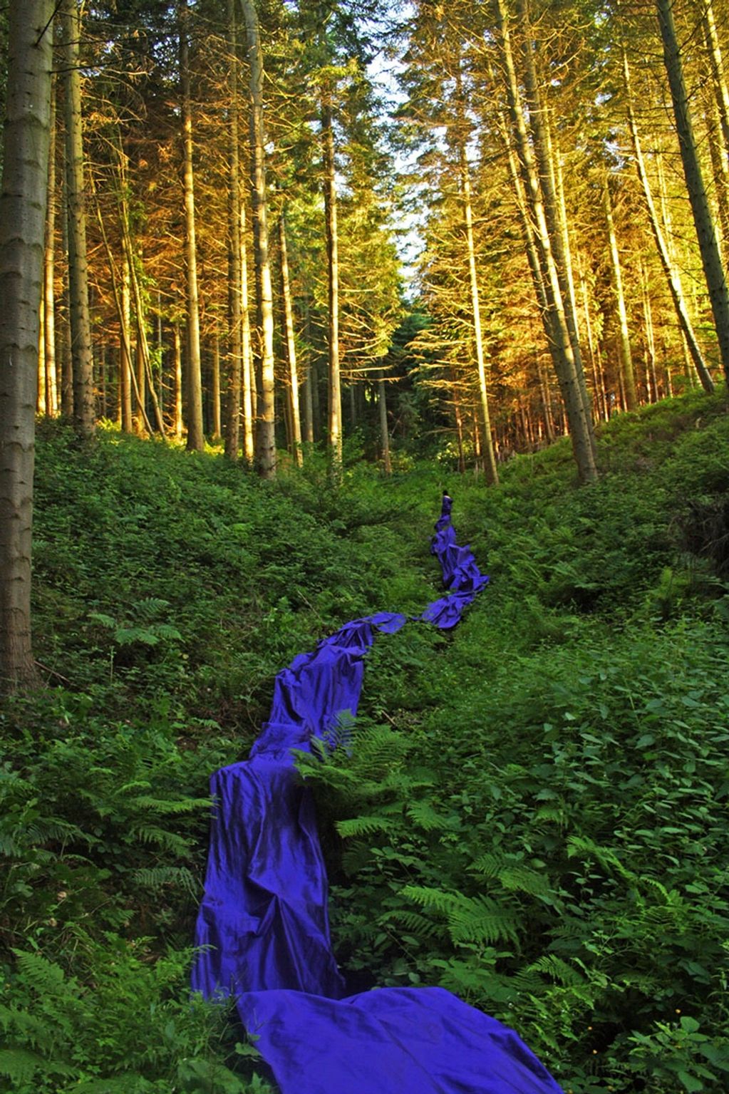 O corpo trazia, na imagem, a escala da natureza dali, monumental e com sinais de eternidade. Embrulhar o corpo na cor e arrastá-la por paisagens quase fictícias, com uma vestimenta inverossímil, construindo trilhas violetas sobre o verde intenso, com a vontade